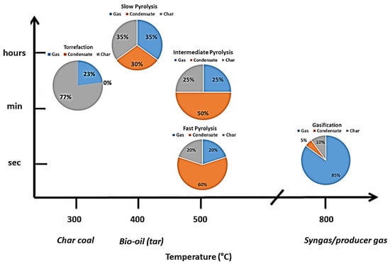 Other relevant processes that can be considered comparable to pyrolysis are torrefaction and pyrolytic gasification (Figure 4). Both take part in the absence of oxygen, but the former happens at temperatures under 300 °C, and a residence time of around 2.5 min, thus targeting the production of carbon-rich solid fuels [101]. The latter performs gasification in two stages, employing steam as a fluidizing agent, aiming for the production of a bio-syngas with a heating value between 1 and 20 MJ/m3, mainly owing to a high methane fraction [88].