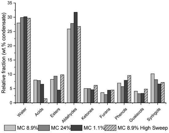 Fonseca et al. [98] studied the effect of the feedstock moisture content and the throughput of sweeping gas (N2) on the product distribution of fast pyrolysis of wheat straw (continuous operation, 10 kg/h) (Figure 5). One can observe the effect of the moisture content (MC) and vapor residence time (low sweeping = 1.3 Nm3 h−1, high sweeping = 3.2 Nm3 h−1) in the functional group distribution (based on GC/MS analyses, discounting undetected fraction) of the organic condensate obtained at the Python PDU, KIT Campus Nord, Karlsruhe, Germany. The presence of water vapor, mostly from drying of the biomass, further dilutes the mixture and promotes thermal cracking reactions. Aldehydes are known for being especially vulnerable to this situation, explaining the trend [132]. On the other hand, the lowering of the vapor residence time (due to the increased sweeping rate in the reaction) within the reactor can lead to a more significant recovery of higher molecular weight compounds (furans, guaiacols, syringols), which would otherwise undergo cracking, leading to higher condensate production [98].