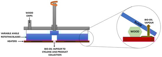 Fast pyrolysis processes often report high liquid yields, up to 75 wt.% db., along with sensitively equal yields in gases and char, which are considered by-products. In this kind of process, heat transfer must occur extremely rapidly within the individual feedstock particles; hence, the feedstock is usually supplied ground to the order of millimeters. Additionally, to make the heat transfer fast and efficient, heat carrier systems are often employed [13]. As the bio-oil (Fast Pyrolysis Bio-oil, FPBO) is the main target, the feedstock’s moisture content (MC) is usually kept below 10% wt. to minimize the amount of water in the liquid [92]. Above 550 °C, the formation of non-condensable gases in the products is favored [12]. To reach liquid yields, over 75% wt. db., a process named flash pyrolysis is in development, featuring residence times that are kept in the range of 30–1500 ms [95].