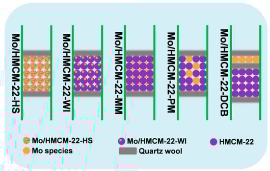 The schematic diagrams of Mo/HMCM-22 catalysts are shown in Figure 1. The diagrams from left to right correspond to the Mo/HMCM-22-HS, Mo/HMCM-22-WI, Mo/HMCM-22-MM, Mo/HMCM-22-PM and Mo/HMCM-22-DCB, respectively. On these Mo/HMCM-22 catalysts, we designed different spatial distributions to gradually expand the distances of the Mo species and Brønsted acid centers. As indicated in Table S1, the average distances between the Mo species and Brønsted acid centers were revealed, and changed from 9.0 × 10−3 to 1.5 × 104 μm for these Mo/HMCM-22 catalysts. In addition, in the MDA process, porous structures and acidic properties of these Mo/HMCM-22 catalysts were also two important factors in determining the MDA performance. Therefore, to reveal the porous structures and acid properties, we employed multiple characterization techniques to analyze the structural and chemical features for these Mo/HMCM-22 catalysts.