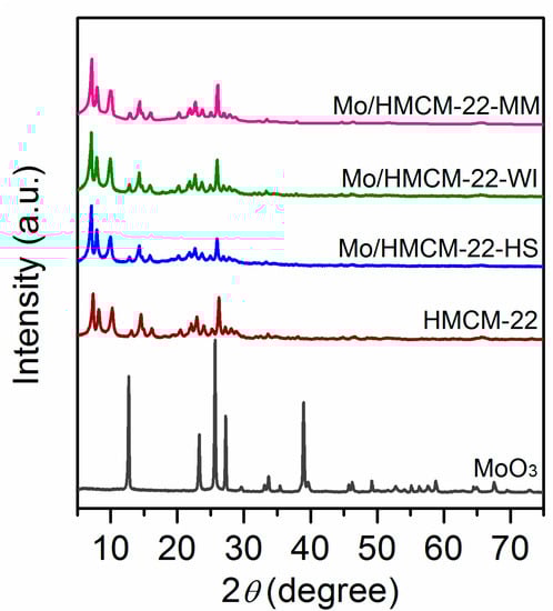 The XRD analysis was utilized to investigate the crystal structures of Mo/HMCM-22 catalysts. Pure MoO3 and HMCM-22 zeolite were employed as reference samples in the analysis. As shown in Figure 2, the Mo/HMCM-22-HS, Mo/HMCM-22-WI and Mo/HMCM-22-MM exhibited the same diffraction patterns as that of the HMCM-22 zeolite, indicating similar zeolite structures. Moreover, we did not observe the characteristic peaks of MoO3 on these Mo/HMCM-22 catalysts. This suggests that the HMCM-22 zeolite was the main structure for these Mo/HMCM-22 catalysts, and the MoO3 species was highly dispersed on them.