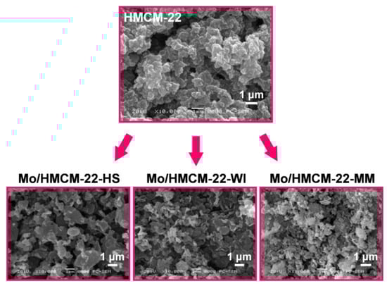 Scanning electron microscopy (SEM) images for the HMCM-22 zeolite and Mo/HMCM-22 catalysts. (top) HMCM-22 zeolite, (bottom left) Mo/HMCM-22-HS, (bottom center) Mo/HMCM-22-WI, and (bottom right) Mo/HMCM-22-MM.