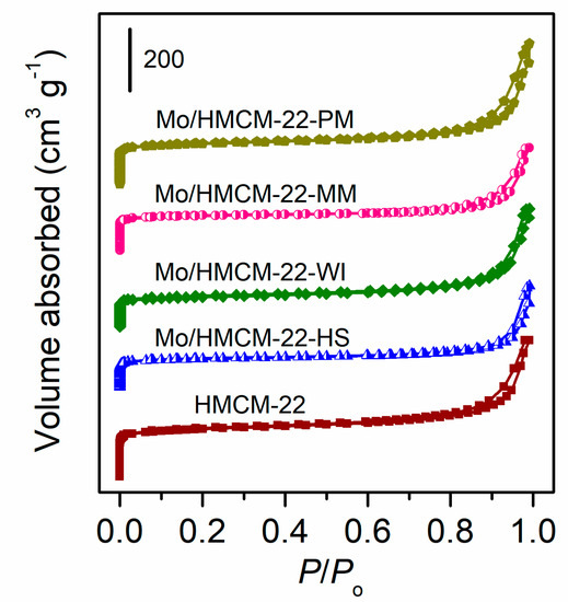 The Mo contents and Si/Al ratios of Mo/HMCM-22 catalysts were measured by EDS [29,30] and X-ray fluorescence (XRF) analyses. The results in Table 1 show that the Mo contents were around 6 wt% and the Si/Al ratios were about 20 for all the Mo/HMCM-22 catalysts. In addition, we employed N2 physisorption to investigate textural properties for the Mo/HMCM-22 catalysts. As indicated in Figure 4, the Mo/HMCM-22 catalysts and pure HMCM-22 zeolite exhibit similar hysteresis loops for N2 adsorption-desorption isotherms. Moreover, they also display similar total volume (Vtotal), micropore volume (Vmicro) and mesopore volume (Vmeso), respectively, as in Table S2. Although BET surface areas (SBET) were different on these samples, the similar pore structures revealed that shape selective functions towards aromatics were not changed on the Mo/HMCM-22 catalysts.