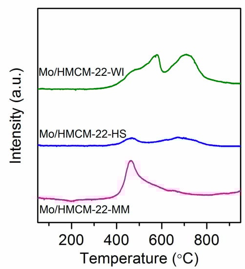 The H2-TPR results are compared in Figure 5. The Mo/HMCM-22-WI exhibit three main peaks for its TPR profile. The first peak at 460 °C was attributed to reduction of MoO3 to MoO2 [31,32]. The second peak at 570 °C was caused by strong interaction between the MoO3 species and HMCM-22 zeolite. The third peak at 710 °C was due to further reduction of the MoO2 species [33,34]. In comparison to the Mo/HMCM-22-WI, the Mo/HMCM-22-HS generated a very low intensity for the H2-TPR peaks. This demonstrated that it was difficult to activate the Mo species inside the Mo/HMCM-22-HS. Unlike the Mo/HMCM-22-WI and Mo/HMCM-22-HS, the Mo/HMCM-22-MM only showed a broad peak at a temperature range from 400 to 700 °C. This observation suggests that the preparation method of mechanical milling not only controlled the distance between the Mo species and HMCM-22 zeolite, but also significantly improved the ability for reduction of the Mo species.