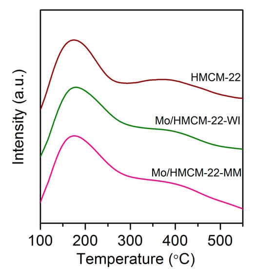 To elucidate the acidic properties, we performed NH3-TPD analyses for the HMCM-22 zeolite, Mo/HMCM-22-WI and Mo/HMCM-22-MM samples as in Figure 6. On these samples, two peaks are observed in the NH3-TPD profiles. The low-temperature peak at 180 °C was attributed to physical adsorption of NH3 molecules, and weak interaction between NH3 molecules and weak acid centers. The high-temperature peak at 400 °C was ascribed to strong interaction between NH3 molecules and Brønsted acid centers [35,36]. The pure HMCM-22 zeolite exhibited higher intensity for the high-temperature peak than the Mo/HMCM-22-WI and Mo/HMCM-22-MM catalysts. Moreover, the TPD profile of the HMCM-22 zeolite was the same as that of Mo/HMCM-22-HS catalyst as in Figure S2. In particular, Mo/HMCM-22-WI and Mo/HMCM-22-MM catalysts formed similar NH3-TPD profiles. This demonstrated that these two samples generated similar acidic properties. The similar acidic properties further indicate that they should possess the same ability for aromatization of the intermediates to benzene product in MDA process.