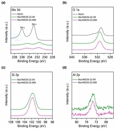 We further employed XPS analysis to investigate surface chemical states for MoO3, Mo/HMCM-22-WI and Mo/HMCM-22-MM samples as in Figure 7. The Mo 3d region is displayed in Figure 7a. The pure MoO3 sample exhibits two photoelectron peaks at binding energies of 232.9 and 236.1 eV. They should correspond to 3d5/2 and 3d3/2 core levels for molybdenum oxide (Mo6+), respectively [37,38]. The Mo/HMCM-22-WI and Mo/HMCM-22-MM catalysts display lower binding energies for the characteristic peaks of the Mo 3d region, as compared to the pure MoO3 sample. This is due to the fact that low oxidation state of molybdenum oxide was formed on these two samples. Especially, the Mo/HMCM-22-WI and Mo/HMCM-22-MM samples also showed a similar Mo 3d spectrum. It suggests that they possessed the same surface chemical states for Mo species. In addition, the O 1s region is displayed in Figure 7b. The peak at binding energy of 530.9 eV was attributed to O1s for pure MoO3, and the peak at binding energy of 531.3 eV was assigned to O 1s for HMCM-22 zeolite [39,40,41]. The O 1s spectra also uncovered that the Mo/HMCM-22-WI and Mo/HMCM-22-MM formed similar O species. In addition to the Mo 3d and O 1s regions, the Si 2p and Al 2p regions further demonstrated that the Mo/HMCM-22-WI and Mo/HMCM-22-MM catalysts also generated the same surface chemical states for Si and Al species as in Figure 7c,d. Thus, we confirmed that the Mo/HMCM-22-WI and Mo/HMCM-22-MM catalysts provided the same surface chemical states of Mo, O, Si, and Al species for MDA process.