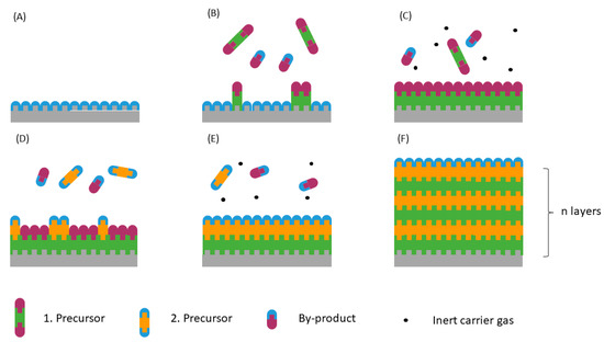 The principle of operation of the atomic layer deposition technique. The substrate before the deposition (A), exposure of the first precursor (B), first purging step (C), exposure of the second precursor (D), second purging step (E), and the formed layer or nanoparticle after n cycles (F).