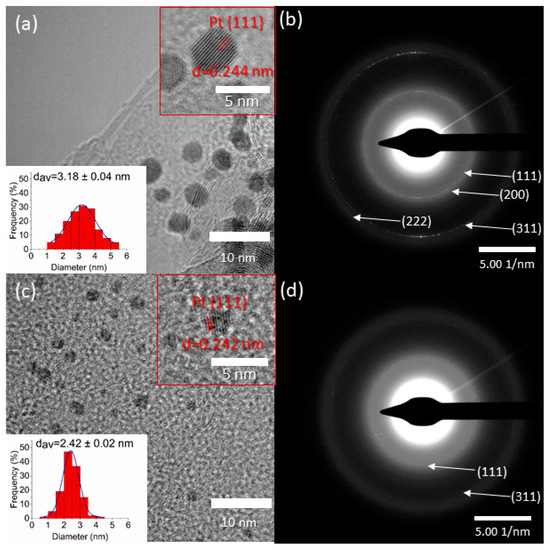 The morphology of the ALD-prepared composites was investigated by transmission electron microscopy. As can be seen in Figure 2a,c, platinum nanoparticles were distributed evenly on the surface of the carbon support, while fewer nanoparticles were formed in the titanium-dioxide-containing gas diffusion electrode. This agrees well with the weight measurement, where a significantly lower loading was found in the case of the titania-containing electrode. The average particle sizes were 3.2 nm and 2.4 nm in the 20 ALD cycles of platinum (20c Pt) and 25 ALD cycles of titanate and 20 ALD cycles of platinum (25c TiO2 + 20c Pt) catalysts, respectively. The difference in particle size could be attributed to the difference of the surface energy, and consequently, the wettability of the carbon and TiO2-covered carbon supports. The smaller particle size implies higher surface area, which in turn means more active sites for methanol oxidation. Although Frelink et al. reported decreasing Pt catalytic activity with decreasing particle size under 4.5 nm [23], we found higher mass activity with smaller nanoparticles on titanate-covered carbon paper. In the top-right corner of Figure 2, a higher-magnification image can be seen where the lattice distances corresponding to the (111) Miller index plane of platinum are indicated. In Supplementary Materials Figure S3a the transmission electron microscopic images of the polyol-synthetized catalysts are demonstrated. It can be seen that the as-prepared platinum nanoparticles are slightly larger—4.4 nm on average.
