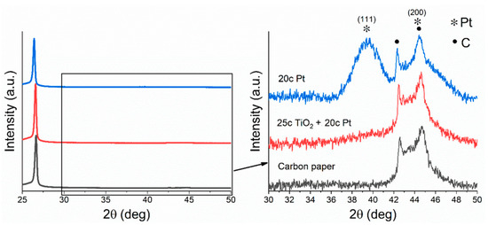 Figure 3 shows the XRD patterns of the ALD-synthesised electrodes. In the case of the 20c Pt electrode, the two reflections at 39.5° and 44.4° correspond to the platinum (111) and (200) planes. In the case of the titania-containing electrode, the reflections of platinum are broadened because of the smaller particle size. In the unmodified carbon paper, the two reflections are attributed to the (100) and (101) planes of the graphite content of the carbon fibre GDL.