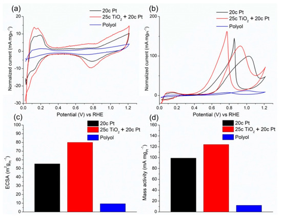 The most important benefit of the ALD method is that it utilizes the expensive platinum metal much more efficiently than wet chemical catalyst synthesis methods. This is evident from the mass activity values (Figure 4d), which were found to be significantly higher in ALD catalysts than in the polyol-based reference material. The mass activity of the 20c Pt electrode was 99.3 mA mg−1, while in the case of the titanate-containing catalyst it was 125.7 mA mg−1. Although it was previously reported that the mass activity decreases with decreasing particle size, we found the opposite tendency below 4.5 nm [23]. We assume that despite the smaller size, the increased mass activity can be linked to TiO2. Deng et al. found changes in the electronic structure of Pt after it was deposited on a TiO2-containing catalyst. This can be linked to strong metal–support interactions, which can ultimately cause the weakening of Pt–CO bonds [22]. However, this phenomenon needs further investigation.