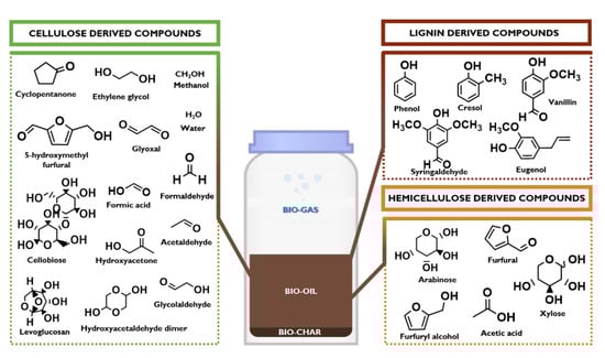 In a green and sustainable perspective, the world is moving from a strong fossil fuels’ dependence to a consistent use of renewable feedstocks. In this view, Anastas and Green proposed in 1998 “the 12 principles of green chemistry” [1], where a particular attention was also given to (second and third generation) transportation biofuels, chemicals, commodities, and pharmaceuticals directly produced from biomass in modern biorefineries [2,3,4,5,6]. This transition is given not only by the matured awareness that fossil resources are running out, but it is mostly accelerated by the United Nation decision to adopt the 2030 Agenda for Sustainable Development, a program action of 17 ambitious goals (SDGs) and 169 targets aimed to eradicate the poverty, to protect the planet, and to ensure the prosperity for all [7]. Biomasses, that currently supply about 80% of global renewable energy and a low-emissions character, represent a unique sustainable pathway to successfully address SDGs [1,7,8]. Among several technologies that can use biomass waste as the feedstock to produce energy fuels, power, heat, and various high value-added chemicals [9,10,11,12,13,14], an interesting example is the use of lignocellulose (plant based biomasses mainly composed of cellulose, hemicellulose, and lignin) and microalgae (biomasses with high protein and carbohydrate content characterized by the absence of lignin) for the production of bio-oil that can be used as intermediate for the production of liquid bio-fuels [15]. Bio-oil is a dark brown-red colored liquid, with a characteristic smell of smoke and a chemical composition strictly related to the biomass feedstocks containing a wide number of unique compounds generated from the rapid quenching of pyrolytic fragments of lignocellulose [16]. Figure 1 shows the main compounds present in the bio-oil: an aqueous solution of several products derived from the fragmentation of cellulose and hemicellulose and from the depolymerization of lignin. The mixture consists of various organic compounds (20–30 wt%), water (19–20 wt%), water-soluble oligomers (WS, also known as pyrolityc humin), and water-insoluble oligomers (WIS, also known as pyrolityc lignin) (43–59 wt%) that can be efficiently used for several applications, such as drop-in fuel, production of chemicals, and various carbon-based materials [17,18,19,20,21,22].