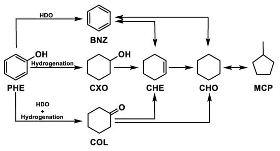 The phenol hydrogenation has been widely studied [89,90,91,92,93]. The reaction pathways are shown in Figure 4, where hydrogen reacts with the phenol (PHE) attacking the hydroxyl group to produce benzene with subsequent production of cyclohexene (CHE) and cyclohexane (CHO). Another reaction pathway of the aromatic ring is the formation of cyclohexanol (CXO) with consecutive hydrogenation in cyclohexene and cyclohexane. A further reaction pathway is represented by the formation of cyclohexanone (COL) with subsequent cyclohexanol hydrogenation in cyclohexene and cyclohexane. Finally, methylcyclopentane (MCP) can be produced by isomerization reaction.