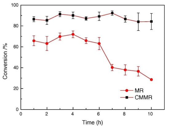 One of the features of the MRs is to act as a contactor between the three phases during HDO reaction. Furthermore, the membrane can have catalytic activity chancing the product distribution as reported by Liu et al. [102], who compared packed bed MR and catalytic MR for the hydrogenation of nitrobenzene in presence of Pd/γ-Al2O3 catalyst. The CMMR showed best performance in term of conversion and catalytic stability (~85% for 10 h) as shown in Figure 8.