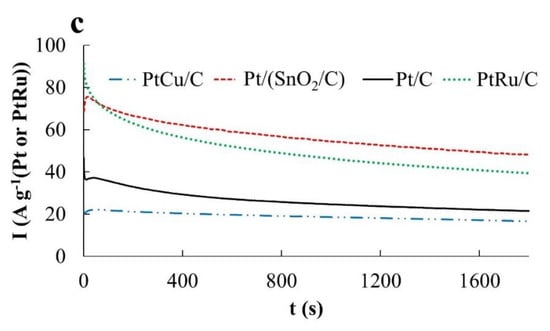 The ratio of the catalyst activities changes significantly if we compare the chronoamperograms of methanol oxidation at a potential of 0.60 V (Figure 5c). Under these conditions, the activity of PtCu/C is minimal, Pt/C is slightly higher, and the activity of the Pt/(SnO2/C) catalyst is much higher. In the latter case, the current strength weakly decreases with time, because of which the activity of the Pt/(SnO2/C) electrode in MOR is slightly higher than that of PtRu/C, whose activity in MOR decreases faster (Figure 5c).