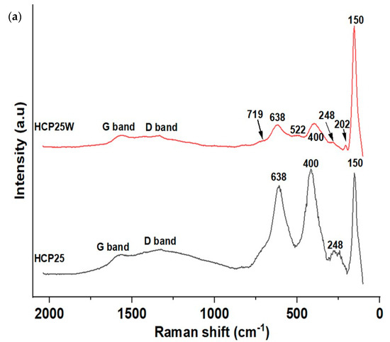 Raman spectroscopy was used to provide chemical information on the composite materials. In Figure 2a,b, the Raman spectra of the composites and the spectrum of P25 and hydrochar are shown. TiO2 anatase-related Raman peaks were observed in both cases at 150 cm−1 (Eg), 400 cm−1 (B1g), and 638 cm−1 (Eg). In HCP25W, anatase peaks were also observed at 202 cm−1 (Eg) and 522 cm−1 (B1g). These peaks are red-shifted compared to the peak positions of pure anatase [36,37,38]. Raman vibration was also observed at 248 cm−1, which could indicate the presence of a rutile phase of TiO2; however, two more intense peaks of rutile at around 440 cm−1 (Eg) and around 610 cm−1 (Ag) seem to be covered by the more intense anatase peaks [38,39,40]. This result gives an indication that the P25 retains both the phases during HTC processing. A small peak was also observed at 719 cm−1 in the Raman spectrum of HCP25W, which could be indicative of the presence of tungsten oxide [41,42]. However, this peak could appear as a shoulder in the HCP25 648 cm−1 peak. When the spectrum of HCP25W is zoomed, very small vibration at 811 cm−1 is observed that could also be indicative of the presence of tungsten oxide. While the spectrum of HCP25 is clearly modified after the addition of W, the tungsten species cannot be reliably identified from the measured Raman spectra.