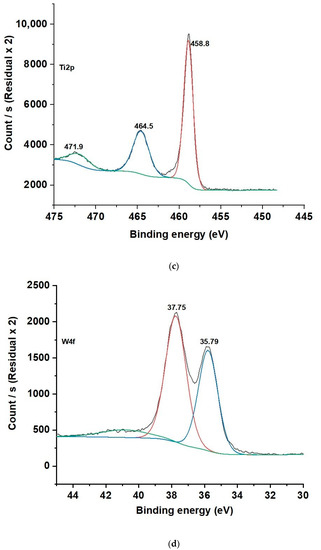 In HCP25W, W4f can be deconvoluted into two peaks at binding energies of 35.79 and 37.75 eV. These correspond to the W4f7/2 and W4f5/2 core levels, which belong to tungsten with an oxidation state of six (W6+) related to the oxide form of WO3 [52]. This is consistent with the 719 cm−1 Raman peak indicating the WO3 in HCP25W.