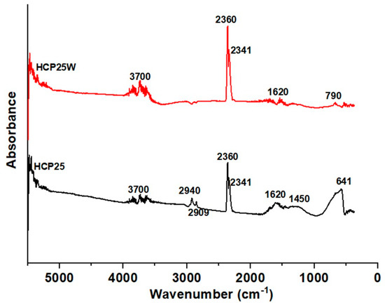 The FTIR-ATR spectra of the prepared composites are presented in Figure 4. For HCP25, a wide spectral feature is observed at around 641 cm−1 related to Ti–O stretching. A similar feature is not observed in the spectrum of HCP25W. A small peak is observed in HCP25W around 790 cm−1 corresponding to the C–H bending for aromatic out of plane deformation. In HCP25, possible C–H bending is covered by Ti–O stretching [33,44,53]. A feature around 1450 cm−1 can be attributed to the C–O carboxyl group, which is especially visible for HCP25 [54]. The peak at 1620 cm−1 for both the materials is related to the skeletal vibration of the unoxidized graphitic domains. The peaks obtained at 2341 and 2360 cm−1 are attributed to the vibration band positions of gaseous carbon dioxide from air [55]. The two peaks at 2909 and 2940 cm−1 correspond to the C–H alkane groups and aliphatic chain –CH2 and –CH3 stretching vibrations [56,57]. The peaks at around 3700 cm−1 are the O–H stretching vibrations of both hydroxyl and carbonyl groups [33]. The FTIR analysis shows that the composite materials produced contain oxygen-containing functional groups. It seems that the addition of tungsten decreases the amount of surface titania visible by absence of the 641 cm−1 Ti–O stretching bond. The vibrations indicating the presence of a carboxyl group (1450 cm−1) are almost absent for HCP25W, while graphitic domains remain. Somewhat less oxygenated groups are visible on HCP25W than on HCP25. The results of ATR-FTIR are consistent with Raman analysis, where TiO2, WO3 and G and D bands of carbon were observed.