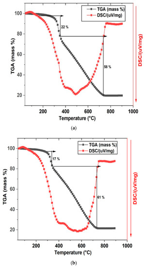Figure 5a,b show the TGA-DSC analysis results of the materials within the temperature range from 20 to 900 °C. The TGA-DSC analysis was carried out under N2 flow for the materials after HTC processing to find out information on the changes occurring during the activation step.