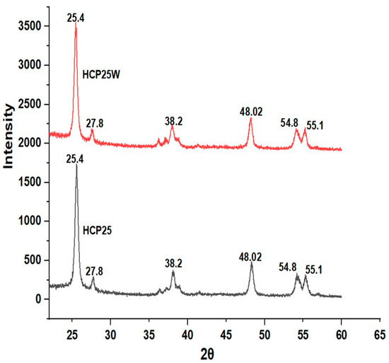 Figure 6 shows the XRD diffraction peaks visible at 2Ɵ = 25.4°, 48.02°, and 55.1° for both materials corresponding to (101), (200), and (105) reflections of the anatase phase of TiO2. Peaks at 27.8°, 38.2°, and 54.8° were also observed that correspond to (001), (021), and (211) reflections of the rutile phase [59,60]. The diffraction peak (101) of TiO2 and that of graphene (002) occur at a similar value of 2Ɵ. Hence, it is challenging to distinguish a graphene peak from an intense TiO2 peak [61]. Based on the results, HCP25 and HCP25W contain about 65% anatase and 35% rutile. This shows that both the phases are retained during the processing; however, the phase composition seems to be different than in the commercial P25 (TiO2) used in the preparation of the composites. The commercial P25 contains about 80% anatase and 20% rutile [62]. A possible amorphous part was not visible in the XRD diffractograms.