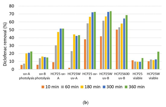 The diclofenac removal results shown in Figure 9b for the composites under light irradiation are calculated based on the analysis of the samples taken after the 30 min adsorption period. After 6 h of irradiation with UV-A, diclofenac removal rates of 52% and 43% with HCP25 and HCP25W were observed, respectively. The degradation was highest under UV-B irradiation, where removal of 73% and 74% with HCP25 and HCP25W were reached. The better removal under UV-B irradiation was expected based on the band gap of P25, which is 3.2 eV [25]. HCP25W was equally effective with HCP25, despite its low specific surface area. The HCP25600 showed 69% removal under UV-B irradiation. Thus, the specific surface area seems not to have a very significant role in diclofenac photocatalytic removal in the case of these materials.