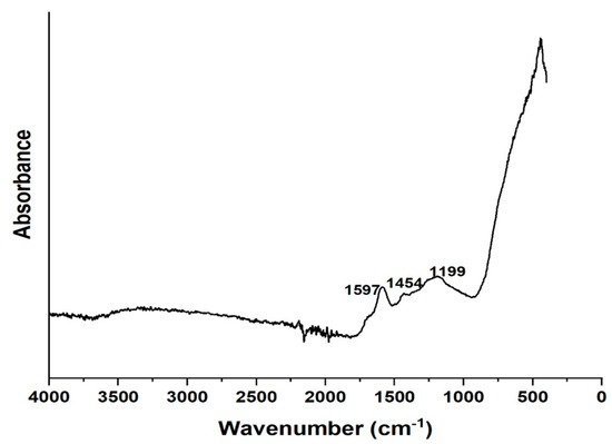 The results showed that the removal of diclofenac via adsorption for 180 min remained at a rather low level. Less than 10% of the diclofenac was removed from the water. Adsorption of diclofenac can be later improved by optimizing the adsorption pH. Figure 11 shows the FTIR spectrum of the composite after adsorption where we observe peaks of diclofenac appearing around 1597, 1454, and 1199 cm−1 [69]. This result evidences the adsorption of diclofenac on the composite.