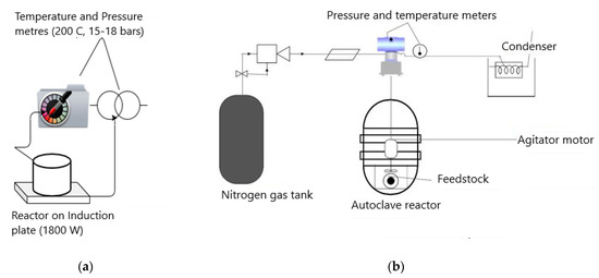 Schematic of (a) the hydrothermal carbonization (HTC) reactor and (b) the activation set up.