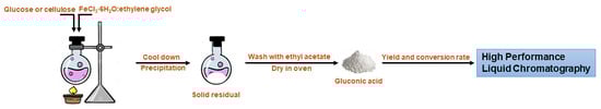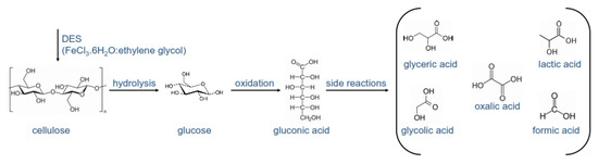 Liu et al. [66] prepared a series of FeCl3·6H2O-based catalytic DESs with ethylene glycol, glycerol, malonic acid, L-alanine, L-serine, xylitol, pentaerythritol, and glycine as HBDs for transformation of cellulose to gluconic acid where the ferric chloride behaved as the catalyst. Most of the DESs had low viscosities, low melting points, and high conductivities. The high conductivities of the prepared DESs compared to other DESs and ILs are important for their electrochemical applications. Among the DESs, the (FeCl3·6H2O:ethylene glycol) DES showed the best performance, with 100% cellulose conversion and 53% gluconic acid yield in 1 h at 120 °C. The interesting point was that gluconic acid could self-precipitate, and the process of product separation could be skipped. Therefore, the employed method had the advantage of integrating solvent and catalyst as well as reaction and separation. Figure 5 illustrates the experimental procedure to obtain gluconic acid from glucose or cellulose.