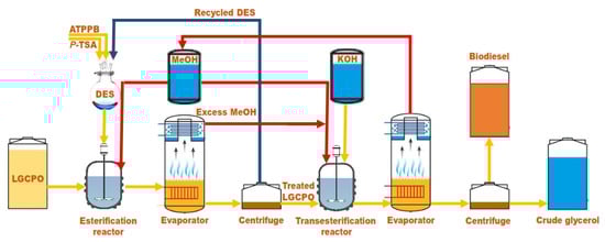 Biodiesel as a promising energy source is an alternative to fossil fuel and is produced from biological sources [126]. Biodiesel is biodegradable and non-toxic with negligible emission profiles [126]. In biodiesel production, the nature of the catalysts is critical in transesterification reactions and biomass transformation [127]. DESs have become a great target of attention for their capability as catalysts in biodiesel production [47]. For example, Hayyan et al. [85] produced internationally standard biodiesel from low-grade crude palm oil (LGCPO) in a two-stage process where a phosphonium-based DES made of p-TSA and allyl tri-phenyl phosphonium bromide (ATPPB) in a 1:3 molar ratio was used in the first stage as the catalyst. Different amounts of the DES (0.25 to 3.5% wt/wt of the DES to methanol) were used to decrease the level of FFA to an acceptable level for transesterification reaction in the second stage. The results showed that under optimum conditions, i.e., 1 wt% DES, 10:1 molar ratio of methanol to LGCPO at 60 °C for 30 min, the DES had a high catalytic activity in the esterification of the LGCPO to reduce FFA from 9.3% to <2%. After the second stage and purification of biodiesel, the product yield was 89.84% with 0.06% FFA. Figure 6 displays the proposed flowchart to obtain glycerol and biodiesel from LGCPO.