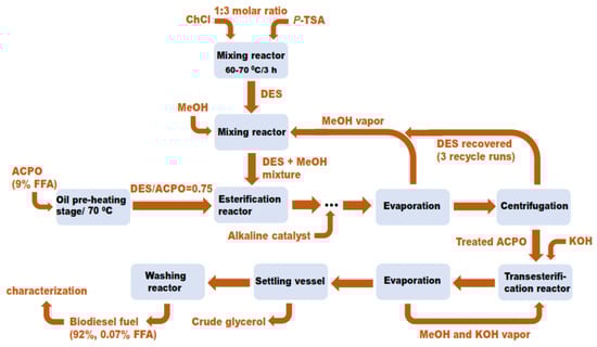 The same research group employed an ammonium-based DES composed of p-TSA and N,N-di-ethyl ethanol ammonium chloride (DEAC) in 1:3 molar ratio for biodiesel production from LGCPO via a pretreatment esterification stage [86]. With the optimum conditions of 0.75% (wt/wt) DES to LGCPO, 8:1 molar ratio of methanol to LGCPO, a reaction temperature of 60 °C for 30 min, the FFA content decreased from 9.5% in LGCPO to <1%. One year later, Hayyan et al. [87] used (ChCl:3p-TSA) DES for the conversion of FFAs in acidic crude palm oil (ACPO) to fatty acid methyl esters (FAME). With 0.75% (wt/wt) DES to ACPO, 10:1 molar ratio of methanol to oil, at 60 °C and for 30 min, the FFA reduced from 9% in ACPO to <1%. After the alkaline transesterification, the FAME content reached 96%. Figure 7 displays the proposed process flowchart for biodiesel production from ACPO.