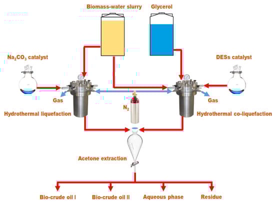Biocrude is obtained from lignocellulosic biomass under high temperature (200–350 °C) and pressure (5–15 MPa) and is usually treated to recover bio-oil. Further upgrading results in production of biofuels with high energy density. The higher heating values (HHVs) of some biocrudes are close to those of petroleum-based crudes [129,130]. There are a few studies where acidic DESs have been used as catalysts to yield biocrude via hydrothermal liquefaction (HTL) processes. For example, Alhassan et al. [6] used de-oiled Jatropha curcas cake to produce biocrude. The biomass was catalyzed by four DESs, namely (ChCl:4KOH), (ChCl:4p-TsOH), (ChCl:3glycerol) and (ChCl:3FeCl3) through a HTL process. The produced biocrude had HHVs from around 21.15 to 24.30 MJ/kg. The yield of the biocrude was the most, 43.53 wt%, using (ChCl:4KOH) DES, followed by 38.31 wt% with ChCl:4p-TsOH DES. However, the only Lewis acidic DES, ChCl:3FeCl3, had the least biocrude yield (30.80 wt%). The HBDs-containing DESs preferentially favored producing aromatic oils through condensation and hydrolysis of lipids. Unlike the other DESs used in this study, with ChCl:3glycerol DES, the long reaction time decreased the biocrude oil yield. One year later, Alhassan et al. [7] performed a comparative study on liquefaction of Jatropha curcas seed biomass using Na2CO3 catalyst and co-liquefaction of the same biomass with glycerol (30 wt%) using ChCl:p-TSA DES to obtain biocrude. The results showed the higher biocrude yield via liquefaction process (32.87 wt%) than that of co-liquefaction process (8.99 wt%). However, the HHV of the biocrude from co-liquefaction process (~31.73 MJ/kg) was higher than that of the biocrude from liquefaction process (~28.80 MJ/kg). The reaction temperature was found to be the most important factor on the bio-oil yield, followed by biomass loading and catalyst type. Figure 8 displays the proposed diagram for hydrothermal liquefaction and co-liquefaction of Jatropha curcas seed biomass.