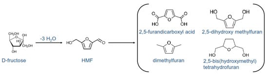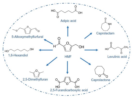 The platform compound 5-hydroxymethylfurfural (5-HMF) produced from lignocellulosic biomass is an intermediate for synthesis of downstream furan derivatives, levulinic acid and many other valuable chemicals (Figure 9) [131,132].