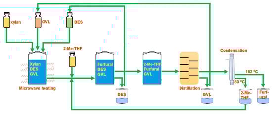 Furfural is a versatile and important bio-based compound derived from lignocellulosic biomass and is used to produce some key platform chemicals [88]. The US department of energy has identified furfural as one of the top value-added compounds with a large world market [133]. For furfural production, industrial processes using mineral acids for pretreatment of biomass or using high-pressure steam for stripping furfural suffered from several drawbacks, most importantly the low efficiency and high energy consumption [88]. The recently investigated approach to produce furfural employed catalysts [134,135] among them are DESs [71,88,97]. Zhang et al. [71] converted xylan and xylose into furfural in a reactor co-catalyzed by trivalent metal chloride (AlCl3·6H2O and FeCl3·6H2O) and ChCl:2citric acid·H2O DES in both monophasic (only DES) and biphasic (DES + methyl isobutyl ketone (MIBK)) processes. The highest furfural yields with monophasic process from xylose and xylan were 59.3% (140 °C, 15 min) and 54.2% (140 °C, 25 min), respectively. In the biphasic system, the highest furfural yields from xylose and xylan were 73.1% (140 °C, 25 min) and 68.6% (140 °C, 35 min), respectively. In both processes, AlCl3·6H2O was the selected metal chloride for optimum conditions. Recently, Morais et al. [97] tried two acidic DESs, ChCl:malic acid and ChCl:glycolic acid in different molar ratios, to act as both catalyst and solvent for the conversion of xylan to furfural. In their study, the effects of water and γ-valerolactone (GVL) contents, microwave heating and solid to liquid ratio (S/L) were considered. The highest furfural yield, 75%, was achieved with ChCl:3malic acid DES containing 5 wt% water at 150 °C for 2.5 min, with S/L of 0.05 and the GVL weight ratio of 2:1. Figure 12 represents the proposed flowchart for recovery of the produced furfural from xylan.
