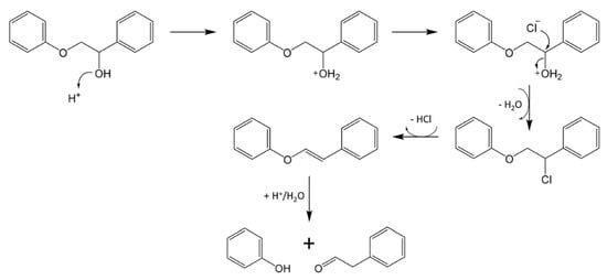 The delignification mechanism and the catalytic cleavage of β-O-4 ether bond present in biomass were studied on the lignin model 2-phenoxy-1-phenylethanol (PPE) compound with acidic DESs [100]. To this purpose, three DESs, namely 2propionic acid:urea, ChCl:10lactic acid and ChCl:p-TSA were used. The acidity of each DES affected the β-O-4 ether bond. Among the DESs, 2propionic acid:urea DES was unable to delignify the biomass model due to its incapacity to cleave the ether bond. On the other hand, ChCl:10lactic acid DES could cleave the ether bond in PPE, but an unwanted esterification reaction between PPE and lactic acid along with oligomerization of lactic acid occurred. The other DES, ChCl:p-TSA, had the highest performance for PPE cleavage with 57.7% phenol content at 120 °C. However, the high acidity of p-TSA resulted in the condensation of produced species. It was found that the presence of water reduced the DES ability to cleave the ether bond. In addition, the identification of chlorinated and brominated species of PPE (PPE-Cl/Br) before the ether bond cleavage when using ChCl:p-TSA and ChBr:p-TSA DESs revealed the role of halide ion of the DESs in the cleavage of ether bond (Figure 13).