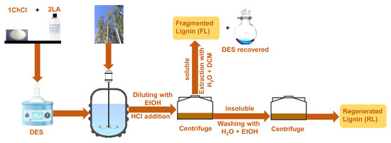 Wang et al. [105] used enzymatic mild acidolysis lignin (EMAL) which has been derived from Eucalyptus tree and β-O-4 lignin model compounds to study the structural variant of lignin fractions after pretreatment with an acidic DES, ChCl:2lactic acid, at different temperatures and reaction times. They found that in both realistic and model lignin, the β-O-4 linkages were cleaved under the influence of the catalytic action of the DES, leading to a decrease in the molecular weight and increase in the hydroxyl groups. They also found that repolymerization of the lignin fragments after depolymerization of lignin may account for the low efficiency of the monomeric products of lignin. Figure 14 illustrates the proposed flowchart for lignin treatment with DES.