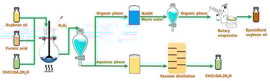 The applications of Brønsted acid-type DESs are not restricted to the above-mentioned materials, and there are a number of other processes where DESs function as catalysts [8,12,65,76,77,93,94,99,103,109]. Wang et al. [8] used three acidic DESs, namely ChCl:oxalic acid·2H2O, ChCl:malonic acid and ChCl:citric acid·H2O to catalyze epoxidation of soybean oil under solvent-free conditions. With (ChCl:oxalic acid·2H2O) DES at 50 °C for 8 h, the conversion of the double bond (%), epoxidized soybean oil (ESBO) yield (%) and selectivity (%) were 88.80, 83.19 and 93.68, respectively. With ChCl:malonic acid DES at 50 °C for 10 h, the conversion of the double bond (%), ESBO yield (%) and selectivity (%) were 85.36, 77.57 and 90.87, respectively. With ChCl:citric acid·H2O DES at 50 °C for 8 h, the conversion of the double bond (%), ESBO yield (%) and selectivity (%) were 74.53, 62.25 and 83.52, respectively. Clearly, it is seen that at the optimum condition, ChCl:oxalic acid.2H2O DES has the best catalytic performance among the DESs used. Figure 15 depicts the flowchart for the production of ESBO.
