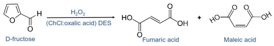 Bodachivskyi et al. [93] used a combination of 1-butyl-3-methylimidazolium chloride ionic liquid and ChCl:oxalic acid DES as an excellent solvent–catalyst system to convert cellulose and native biomass into saccharides with low molecular weights such as glucose, cellobiose, cellotriose, cellotetraose and xylose. At the optimized conditions (120 °C, 6 h), the yield and selectivity were as high as 85% and 98%, respectively. The acid-catalyzed conversion of cellulose was mainly into glucan oligomer chunks from which glucose was obtained. The transformation to glucose was improved by modifying the DESs acidities via addition of Lewis acids or water. Ni et al. [12] oxidize furfural to produce maleic acid and fumaric acid in ChCl:oxalic acid green DES as both solvent and catalyst. At 50 °C and with hydrogen peroxide as the oxidizer, furfural could be converted up to 100% to yield maleic acid and fumaric acid as high as 95.7%. Here, the DES was diluted with water to reduce the viscosity. The molar ratio of the DES constituents was also changed to find the optimum composition. It was found that with 4ChCl:oxalic acid DES, the yields of fumaric acid and fumaric acid + maleic acid were 26% and 46.9%, respectively. In addition, the yield of maleic acid reached 25.3% at 2:1 molar ratio. However, because the viscosity of 4ChCl:oxalic acid DES was high, the 3:1 molar ratio was chosen for further studies. Figure 16 shows the reaction scheme for transformation of furfural into the acids under optimized conditions.