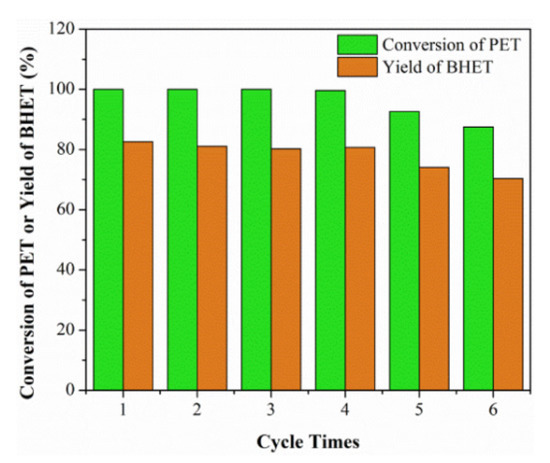 In the chemical industry, recycling technology is an important stage towards sustainability [86]. Recyclability usually involves separation, purification and reusing a solvent or catalyst in successive steps, namely recovering step, refining step and recycling (reusing) step [47]. The whole process greatly affects the solvent or catalyst’s utilization in industrial processes from economic and environmental aspects. In general, the more recyclable a solvent or catalyst, the better it is. In most cases, the chemical efficiency is directly correlated with the recyclability. The recyclability of the applied catalytic DESs have been evaluated in several studies. For example, Song et al. [77] performed a reusability experiment of ChCl:2urea DES in methanolysis of polycarbonate under the optimum reaction conditions. They found that the DES could be reused five times with no significant reduction in polycarbonate conversion, indicating the good reusability of the DES. In the process of conversion of cellulose to gluconic acid, Liu et al. [66] reported no loss of the catalytic activity of 2FeCl3·6H2O:ethylene glycol DES, which was due to the self-precipitation of gluconic acid from the reaction system. Liu et al. [81] used the catalytic DES (1,3-dimethylurea:ZnCl2) in 4:1 molar ratio to convert polyethylene terephthalate (PET) to bis(hydroxyalkyl) terephthalate (BHET). As is shown in Figure 17, the catalyst worked efficiently after being recycled five times.