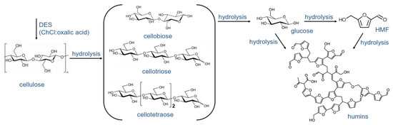 The typical reaction pathway for conversion of cellulosic biomass into value-added chemicals using Brønsted acid-type catalytic DESs.