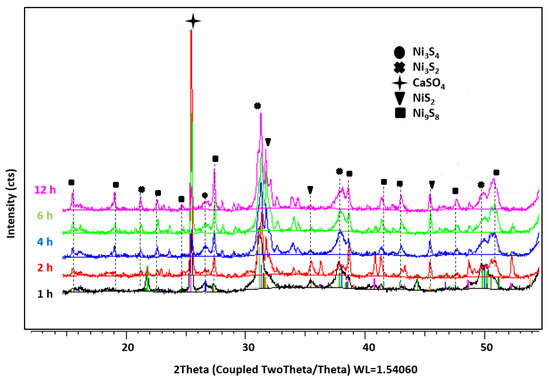 Nonstoichiometric forms of nickel sulfide are NiS2, Ni9S8, Ni3S4, and Ni3S2. The composition of nickel sulfide changes with the reaction time. The Ni3S2 is not detected in the composition of samples, which were treated more than 2 h. The relative content of sulfur sharply increases from 20.3% (1 h) to 50.6% (2 h) and remains at levels of 51–53%.