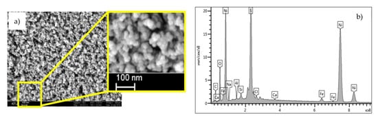 The SEM image and compositions of catalyst surface isolated from extra-heavy oil after aquathermolysis is presented in Figure 2. According to the image, the size of catalyst particles was in the range of 80–100 nm. However, aggregates of micrometer size can be observed, which probably correspond to coke-like compounds such as carbenes and carboids. They form after the cracking of asphaltene molecules due to the loss of alkyl substitutes and functional groups in asphaltenes. It has to be noted that the sizes of catalyst particles isolated after different aquathermolytic treatment time were within the same range.