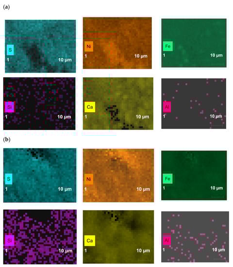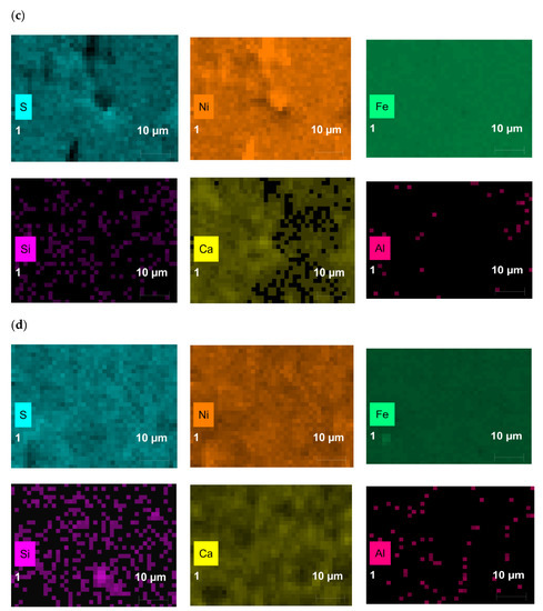 The distribution of elements in the catalysts isolated after thermo-catalytic treatment for 12 h are presented in Figure 3. The results indicate the ambiguous behavior in the weight compositions of Ni, C, O, S elements. During various thermo-catalytic treatment duration, the active form of the catalyst was observed in the form of nickel sulfide. The adsorption of coke-like compounds on the catalyst nanoparticles results to the increase in the content of carbon element. The content of Na and Al metals as well as non-metals such as O, Si, and Cl, which exist in the composition of rocks, were increased.