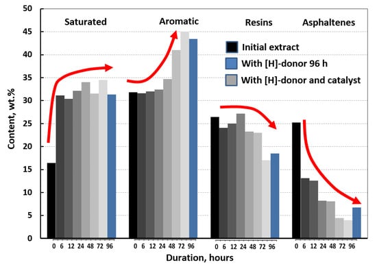 The group composition of core extracts depending on duration of catalytic aquathermolysis are presented in Figure 4. The SARA analysis of core extracts treated less than 48 h were reported in [15]. The time dependence of the catalytic aquathermolysis at 300 °C is obviously observed in destruction of asphaltenes. The content of saturates doubled at relatively short-time treatment periods (6–24 h) due to detachment of alkyl substitutes. The required energy for such process is less. Therefore, the long-time catalytic aquathermolysis is not further increasing the content of saturates. The sharp decrease in the content of asphaltenes was up to 72 h. The further increase in duration of reactions was not effective, as a minimum achievable content was achieved. Asphaltenes are characterized by maximum condensation and the further cracking of high-molecular weight components in the given conditions is impossible. The increase in the content of resins up to 48 h (Figure 4) can be reasoned by joining cracking products of asphaltene molecules. Above 48 h, the asphaltene cracking products no longer join the resin fraction and hence, the content of resins declines due to their chemical destruction. The chemical destruction of resins increases aromatic hydrocarbons. GC-MS results showed new components of aromatic fractions, which were destruction products of resins and asphaltenes. Thus, the catalytic upgrading of extra-heavy oil is the result of several reactions such as thermal destruction, cyclization, dehydrogenation, hydrolysis and alkylation of aromatic rings by intermediate products. The increase in the content of paraffinic-naphthenic and aromatic hydrocarbons with duration of catalytic aquathermolysis is due to the enhancing the influence of cracking reaction.
