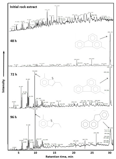 GC-MS results of saturates and aromatics fractions depending on the duration of catalytic aquathermolysis are presented in Figure 5 and Figure 6, accordingly. The low molecular weight alkanes were not present in the initial core extracts. The content of them dramatically increases after catalytic aquathermolysis reactions. The spectra of newly generated hydrocarbons widens after 96 h treatment mainly due to C13–C18 alkanes. This indicates the deep conversion of resins and asphaltenes hydrocarbons. Detachment of alkyl substitutes from asphaltenes after thermo-catalytic treatment were reported in several works [42,43]. Such detachment products increase the content of saturated hydrocarbons, which significantly effects the viscosity of extra-heavy oil.