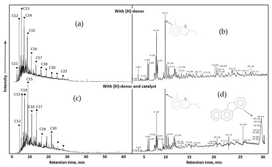 Total ion chromatograms of saturated hydrocarbons (a,c) and aromatic hydrocarbons (b,d) after aquathermolysis in the presence (c,d) and absence (a,b) of nickel-based catalyst for 96 h.