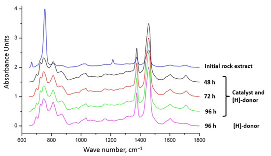 FT-IR of core extracts depending on the duration of catalytic hydrothermal treatment at 300 °C.