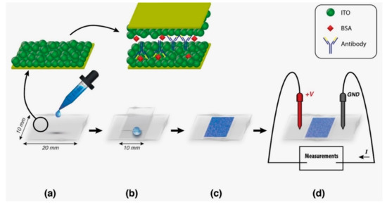 The device used in this study (Figure 1) has two (main and secondary) ITO-coated glass slides. In the main ITO-coated glass slide, the glass acts as a substrate and the ITO layer on top of it acts as a catalyst and a transducer. The secondary ITO-coated glass slide has a similar structure to the main slide and is used to sandwich the sample. The device is connected to electronic components (described in Section 2.3) for measuring the electrical properties. Our procedure is described below.