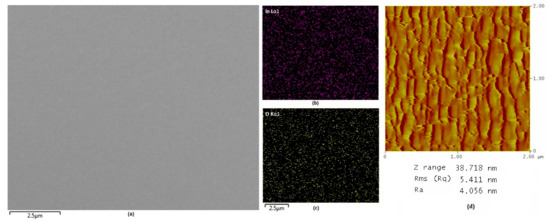 The structure of the ITO nanolayer was determined using scanning electron microscopy (SEM) and atomic force microscopy (AFM). The SEM images were taken using JEOL JSM-5600 (JEOL Ltd., Tokyo, Japan). Figure 2a shows the micrographs of the ITO surface uniformly coating the glass slide. This is consistent with the SEM maps of the oxygen and indium atoms (Figure 2b,c). A DI D3500 Nanoman (Nanoman VS, Veeco, Plainview, NY, USA) was used for AFM measurements. Figure 2d shows the AFM image over the scan area of 2 × 2 μm2. This and other AFM images along with the energy dispersive spectra (EDS), show that the ~nm scale ITO particles are coated on the glass slide with a mean spacing of about 180 nm. This defines the morphology of the ITO. Based on the AFM images, the ITO thin film surface shows a continuous island-like structure. The mean roughness (Ra) is 4.056 nm and the interface width roughness calculated as the route mean square (RMS) is 5.411 nm. RMS is the standard deviation of the surface height within the given area. The above-mentioned thickness for the ITO layer (122 nm) was measured using the spectral reflectance technique via a Filmetrics F40-UV thin film analyzer. In this technique, the thickness is measured based on the amount of light reflected from the film in a wide range of wavelengths from UV to infrared. The results are oscillations in the reflectance spectrum [26]. Therefore, more oscillations in the spectrum result in higher thickness (Figure S1). Although the fit of the model to the experimental data results in 1 nm uncertainty, we use the RMS value from AFM measurements for the variation of the thickness (as a more conservative measure of the uncertainty), so it is reported as 122 ± 5 nm. The EDS shows the presence of oxygen, indium, and tin on the surface. According to EDS, the tin concentration is almost half the concentration of indium.