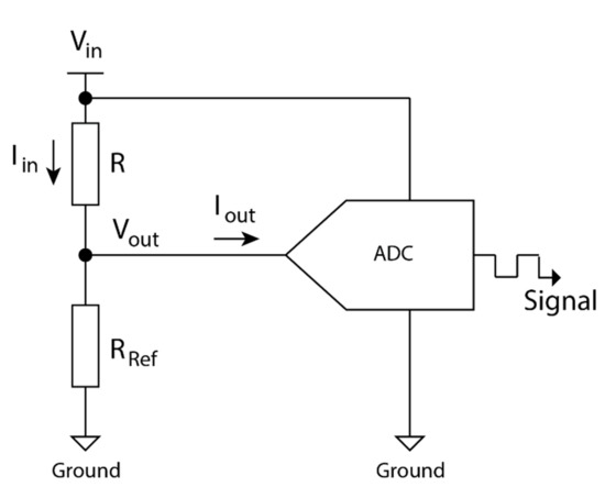 The resistance value of the reference (Rref) was chosen on the same order as the R value (500 Ω in this case) to increase the measurement precision. The current passing through the sensor can also be easily calculated by Equation (3):