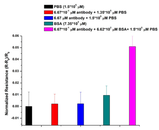 The resistance of the sensor in the dry state was measured prior to pipetting some sample onto the surface to determine the initial surface resistance. After pipetting the samples, the surface resistance of the sensors in the wet state (R) were recorded for 10 min while the samples were in contact with the sensor. The difference between the initial and the final surface resistance of the sensors in the presence of the sample is a measure of the concentration of the antibodies. Figure 4 demonstrates the results of the resistance measurements of the target antibody and two different media solutions. Various volumes of antibody solutions were measured. Using 5 μL, 10 μL, and 20 μL of a sample containing nanomolar quantities of antibody in aqueous solutions of bovine serum albumin (BSA) and phosphate buffer saline (PBS), the changes in surface resistance were 2.3%, 2.7%, and 2.9%, respectively.
