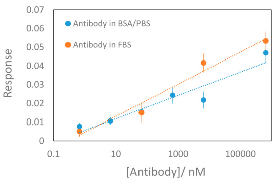 Calibration curves for the response function of the severe acute respiratory syndrome coronavirus 2 (SARS-CoV-2) antibodies in PBS diluted in aqueous BSA solution (blue points and curve) and in FBS (orange points and orange curve).